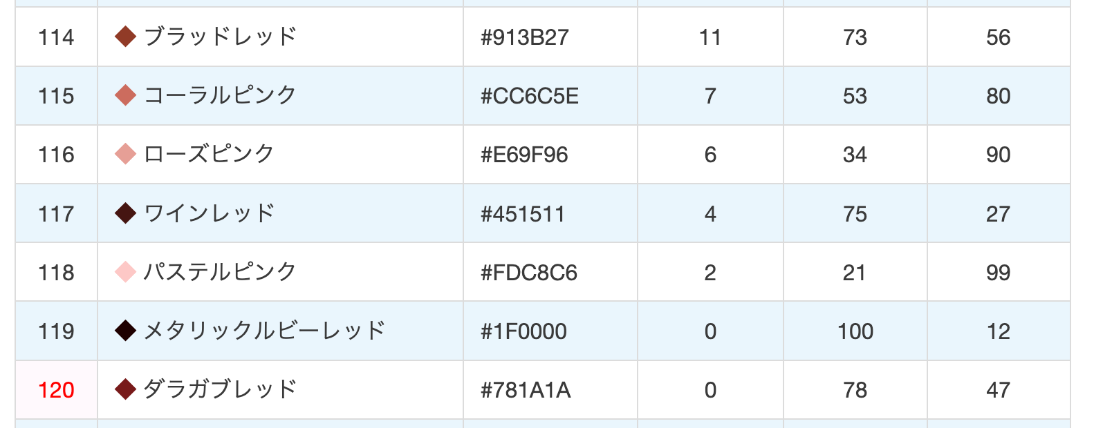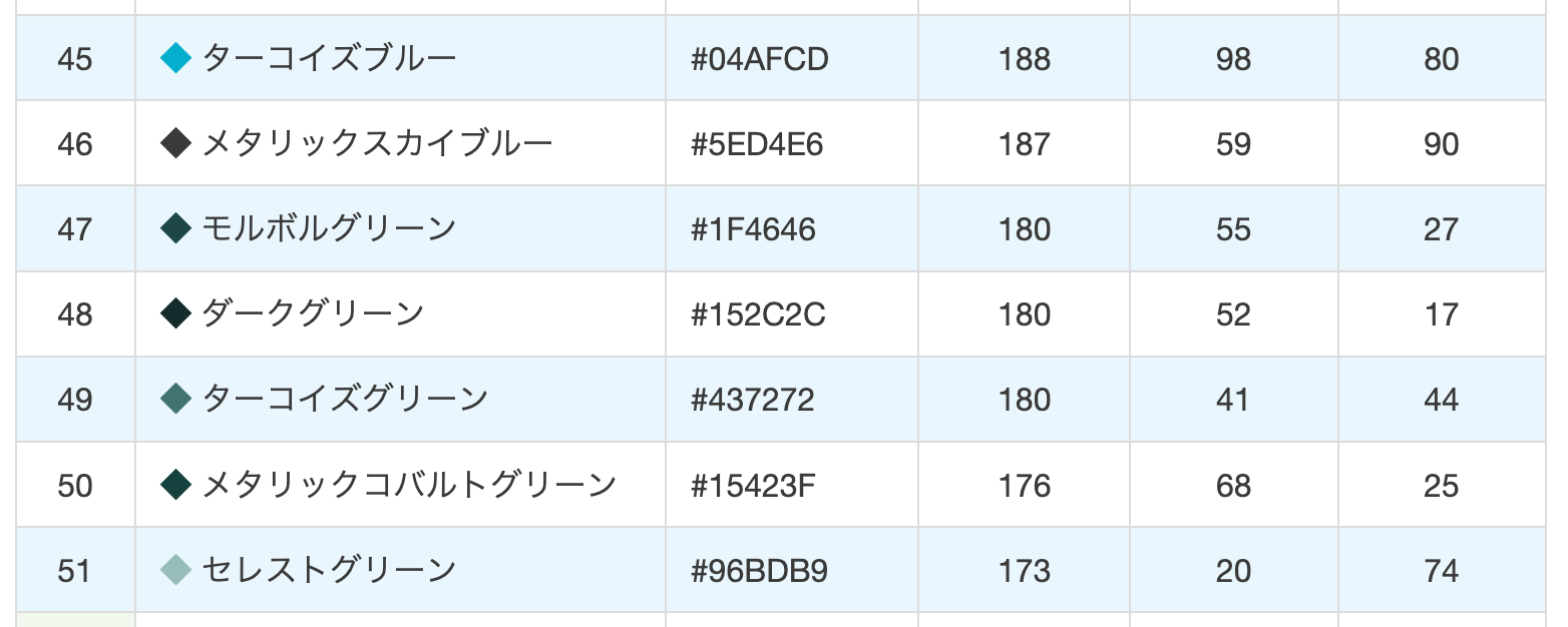 色が連続的な数字になっているので、近い色を探す際に数字を使って簡単に探す事が出来るのです。