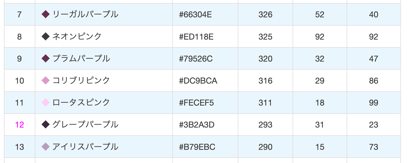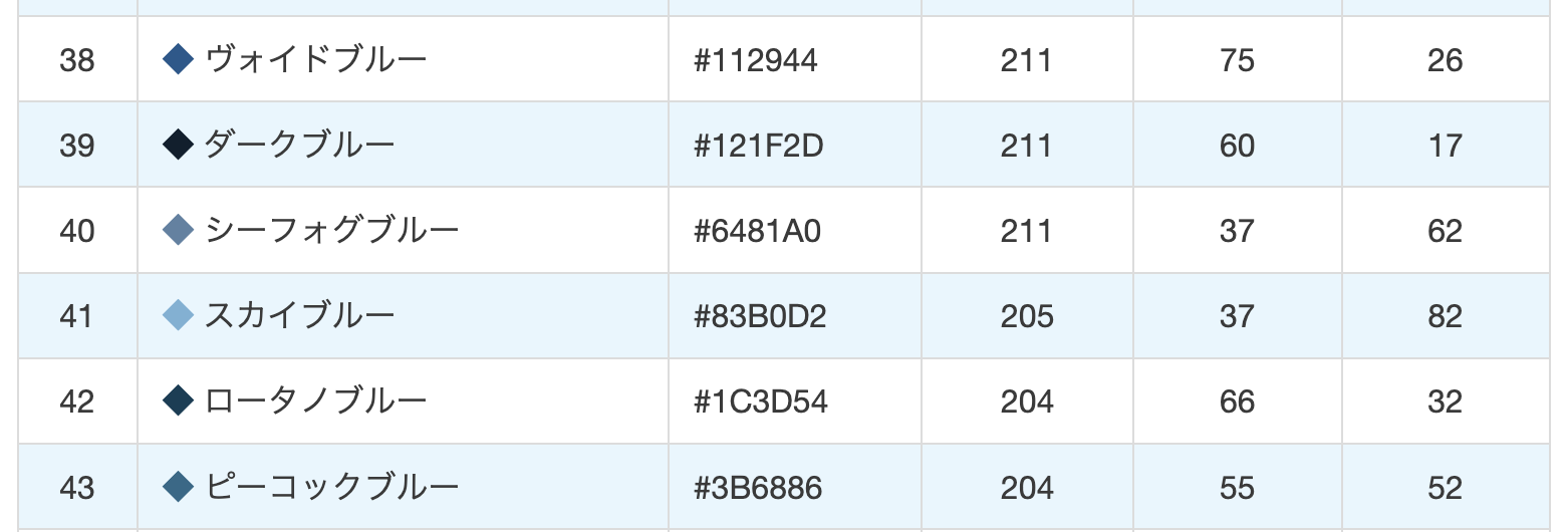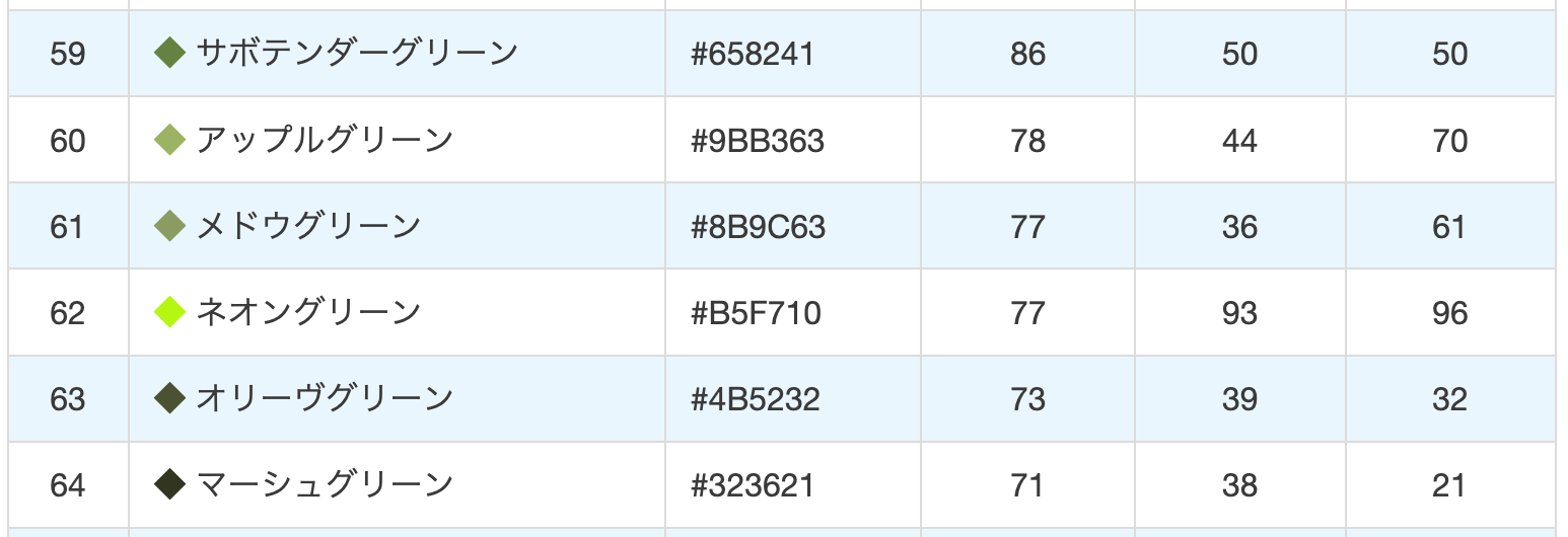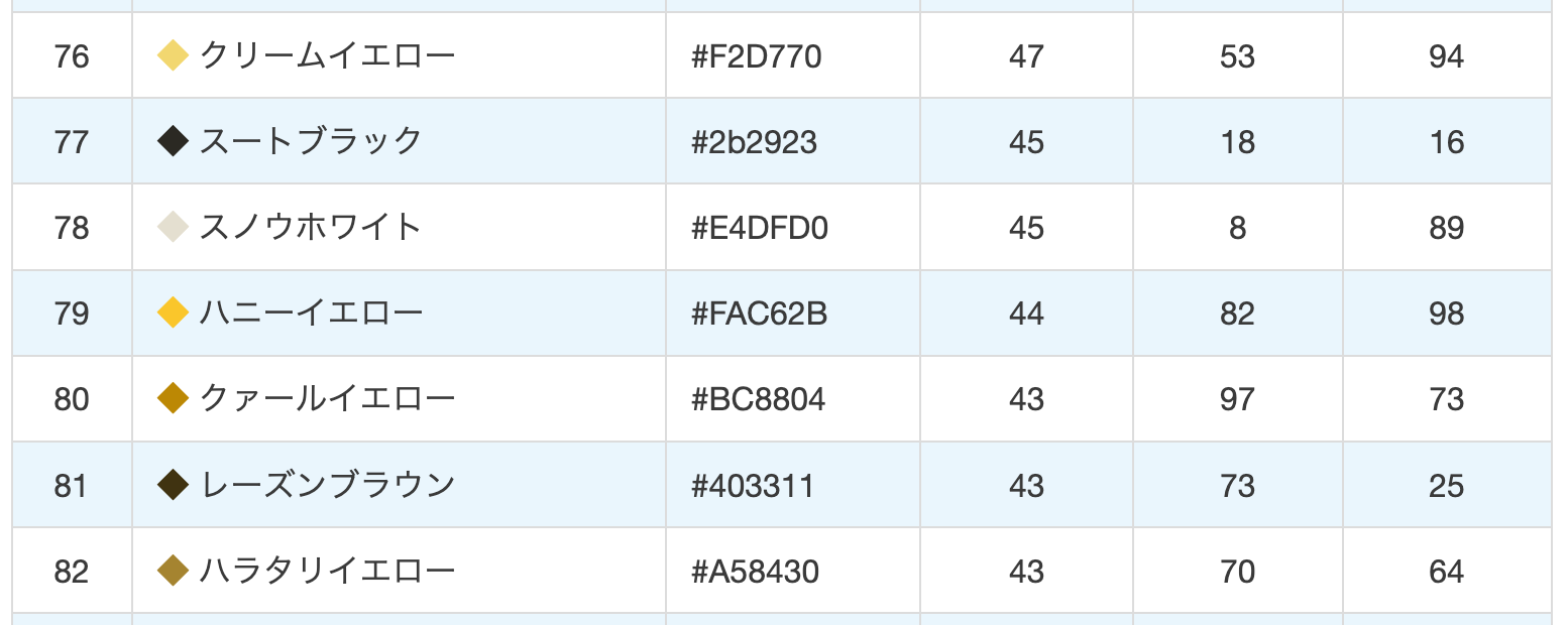 ※ これらの色は一覧表の一部分をそのまま切り取ったものです。