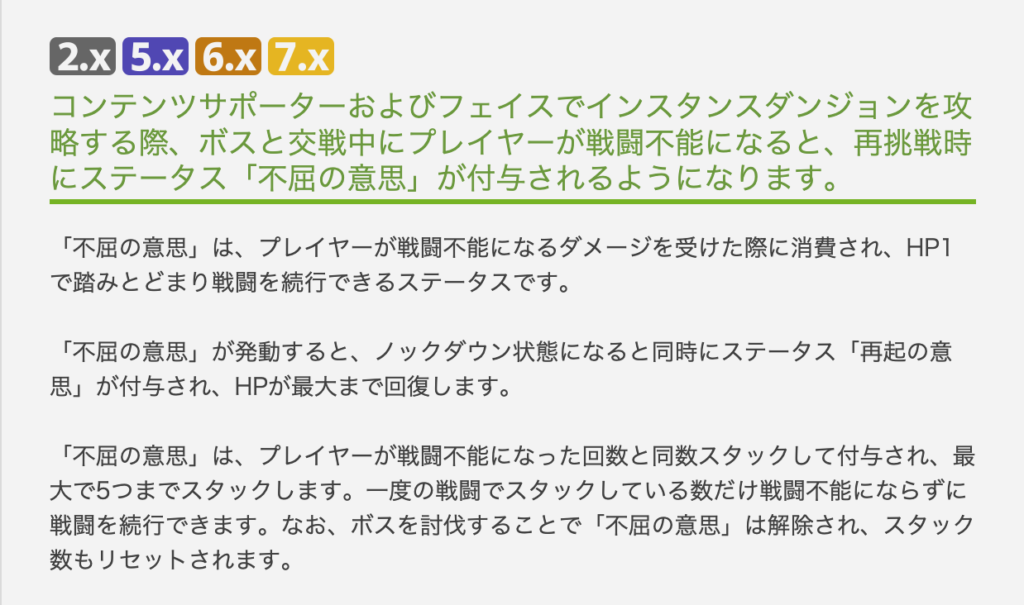「不屈の意思」は、プレイヤーが戦闘不能になった回数と同数スタックして付与され、最大で5つまでスタックします。一度の戦闘でスタックしている数だけ戦闘不能にならずに戦闘を続行できます。なお、ボスを討伐することで「不屈の意思」は解除され、スタック数もリセットされます。