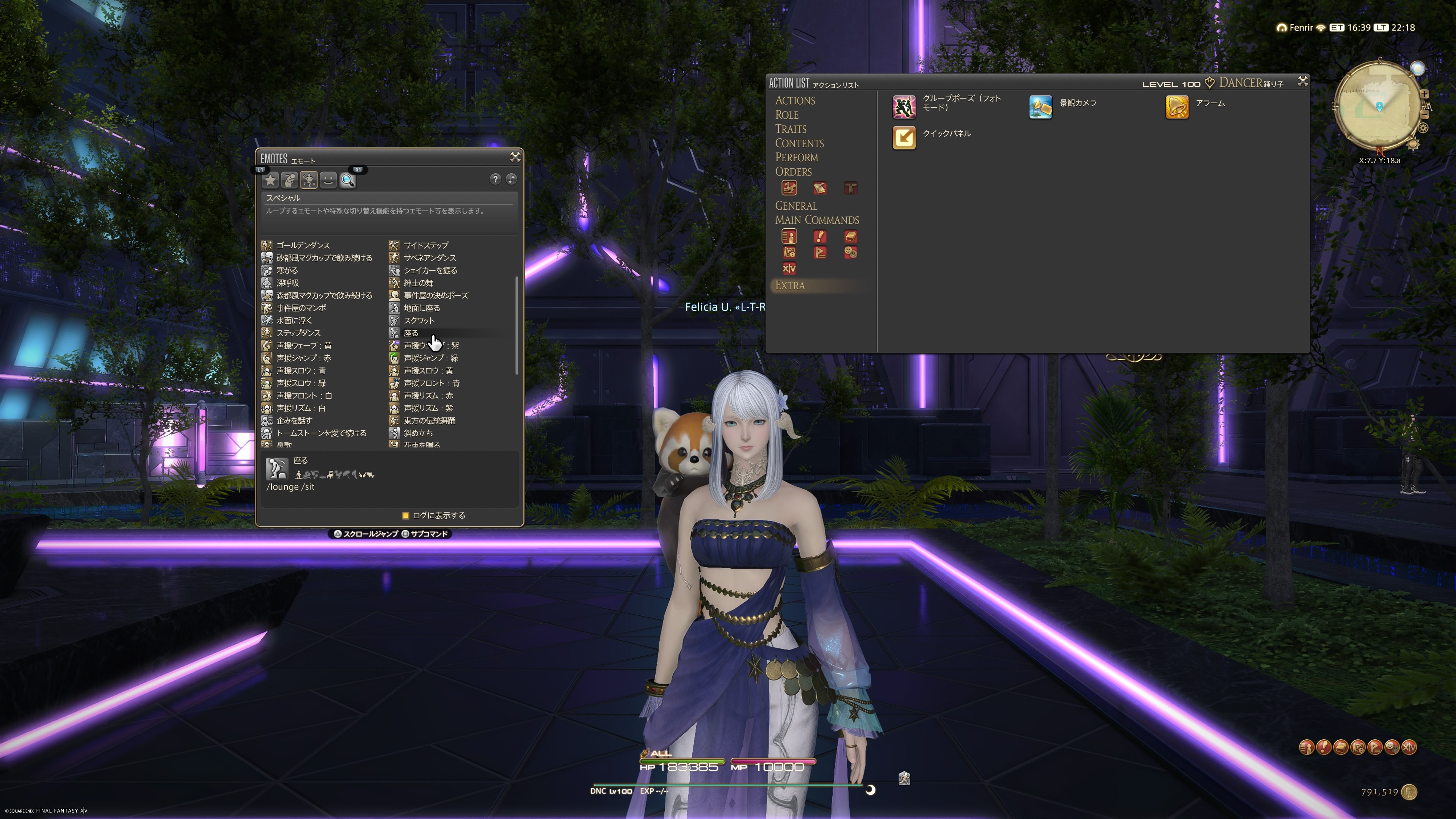 まず、エモート「座る」で座って、もう一度「座る」を使って今度は立って下さい。