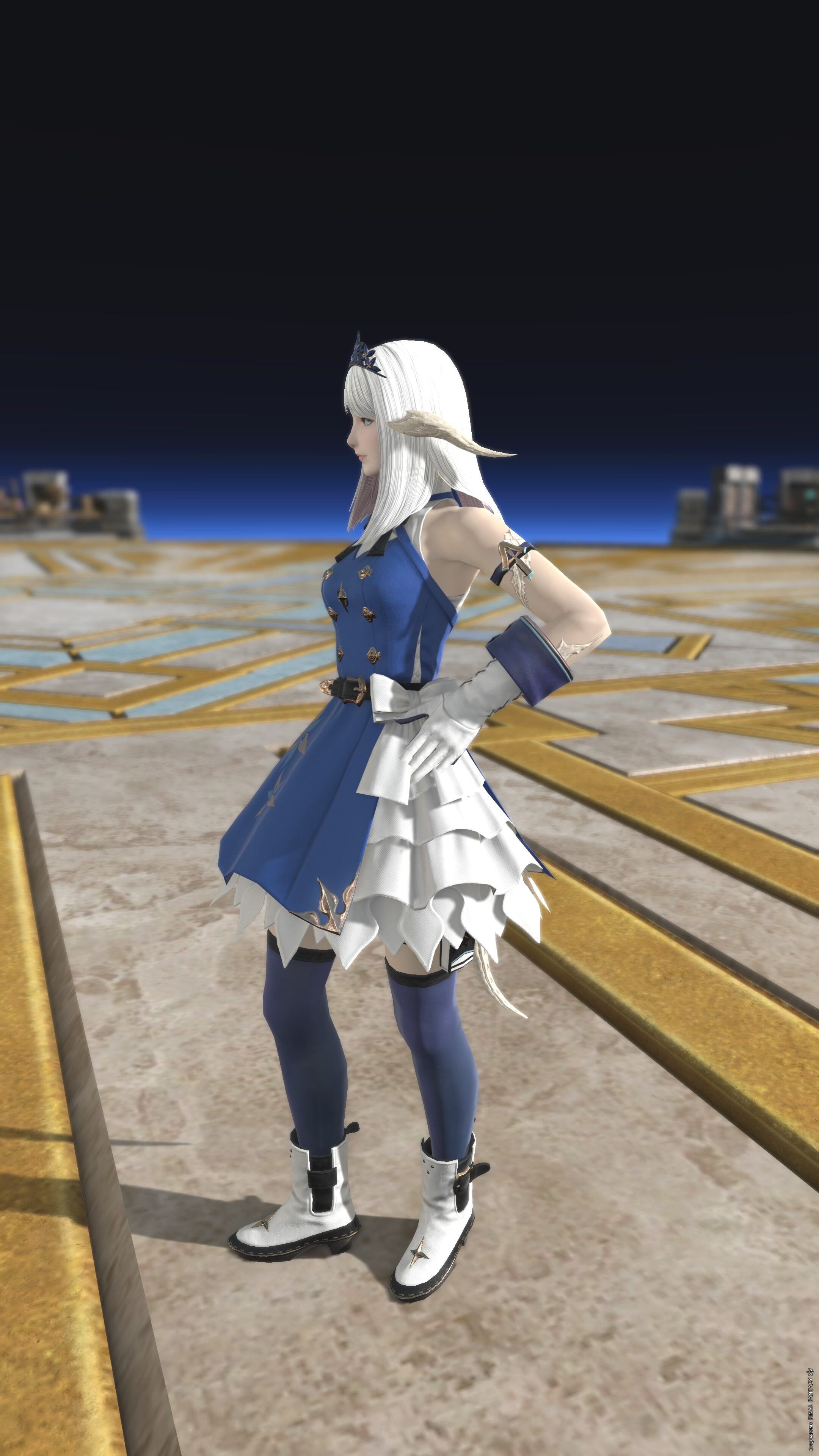 見た目として、腕、手袋の内側がそれぞれ青色、その他「オーバーニー」とでもいうのでしょうか「ひざの上までのストッキング」、ティアラなども青色です。