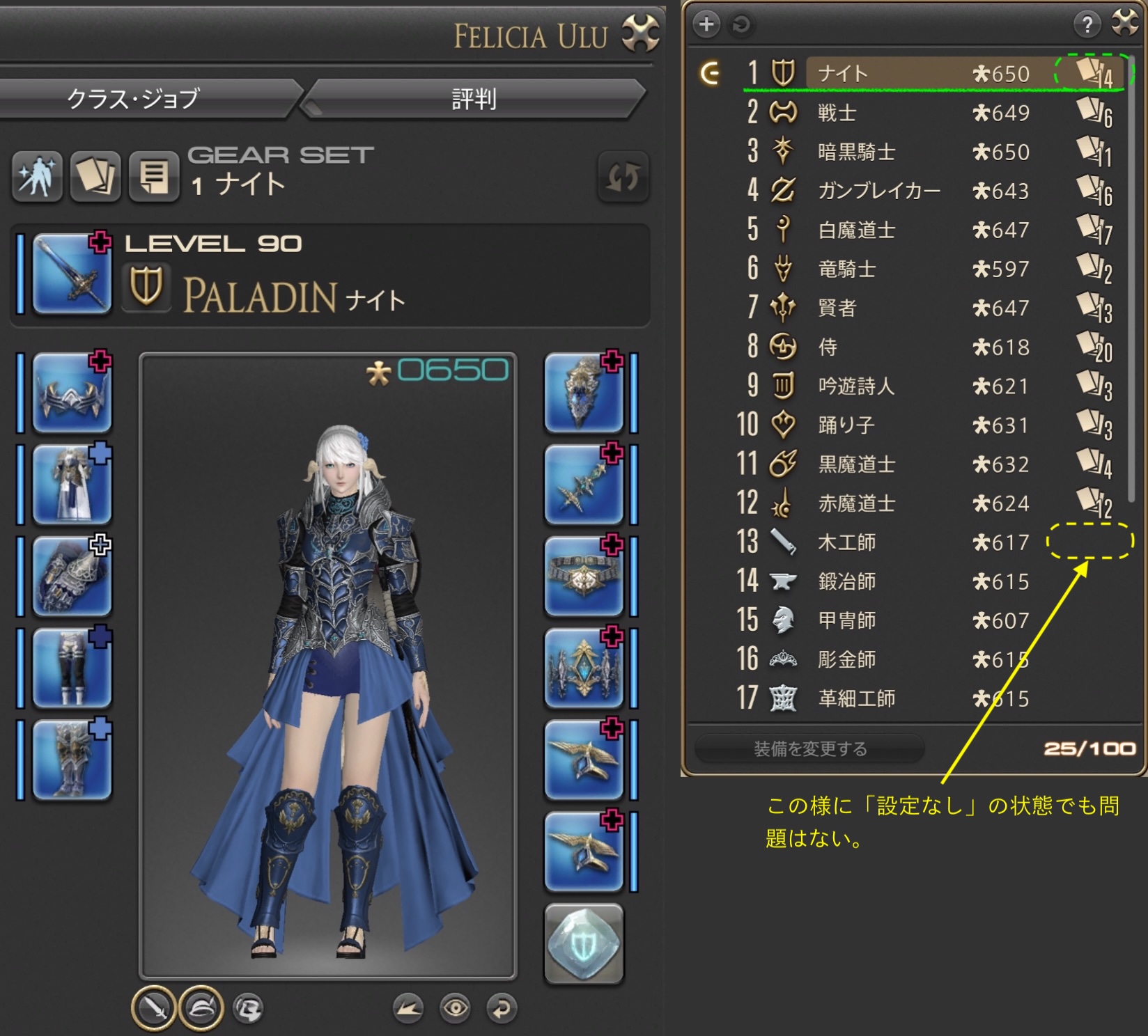 - ジョブをギアセットの1番 へ変更するなど(例の場合は「ナイト」)