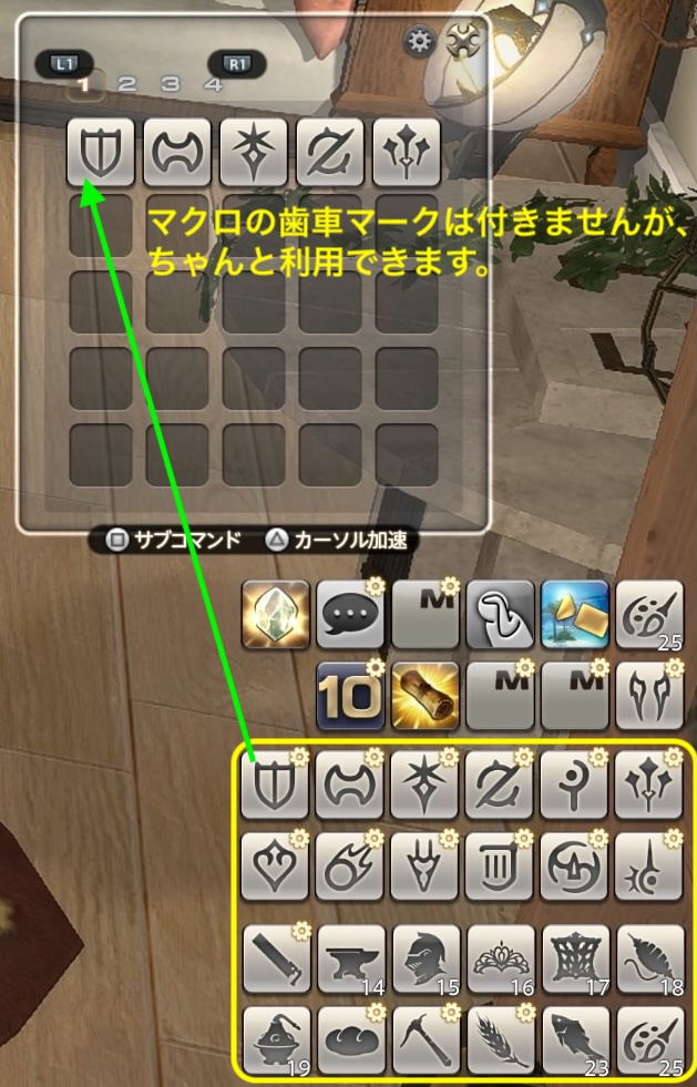 一方の『お着替えマクロ』を使うとその他(❶〜❸)も一緒にジョブ毎で切替えが出来てしまうのです。