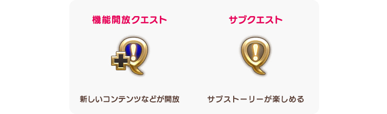 特に「新しい機能が増える大事なサブクエスト」のマークは見た目が少し違います。