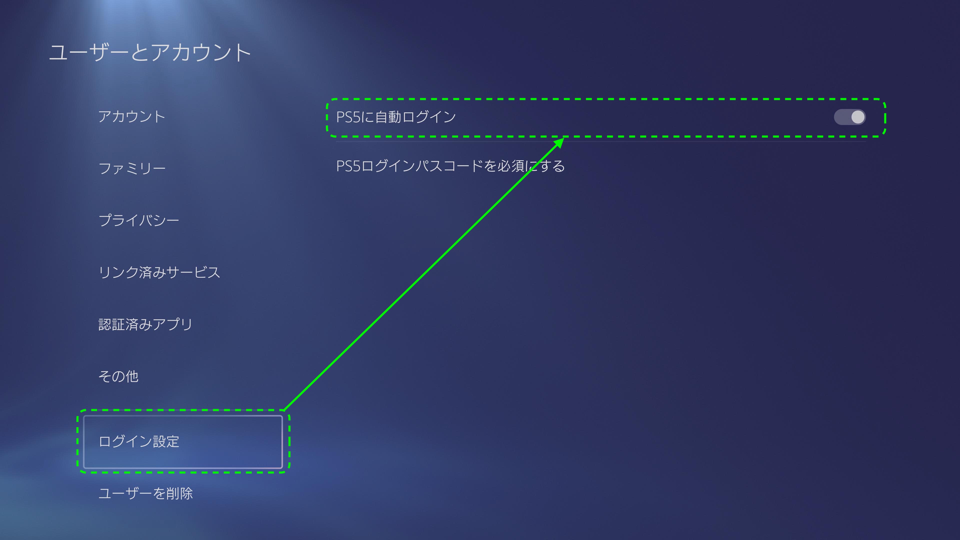[ログイン設定] > [PS5に自動ログイン]をONにします。